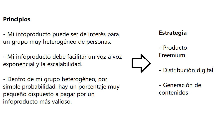 A partir de los principios de Marketing extraídos de un modelo de negocio particular, podemos elegir o generar nuestros propios métodos, como nos pone a pensar H. Emerson. Ej. Si un modelo de negocio indica que mi mercado debe ser masivo y debo extraer rentabilidad de una proporción pequeña de ese mercado, entonces es posible que los principios que pueden regir en algunas de mis actividades de Marketing indiquen que debo generar valor a un precio muy bajo para ese mercado masivo y para luego entregar un valor más amplio a la pequeña proporción que me va a generar rentabilidad. Como funcionan actualmente muchos modelos de infoproductos y cursos en línea, que como modelo basado en este principio escogen el Marketing de contenidos en conjunto con otros modelos y tipos.